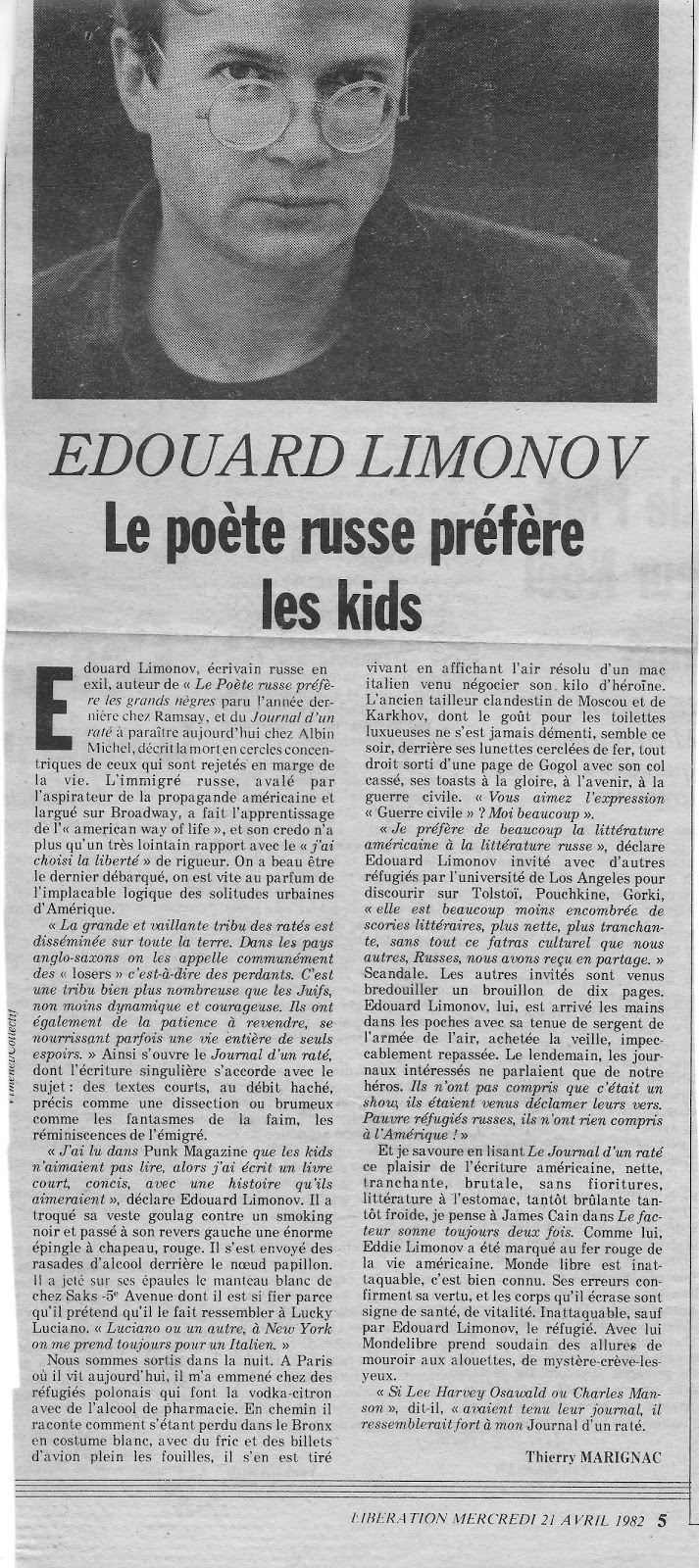 Limonov a acquis une notoriété parisienne dans les années 1980 quand Jean-Jacques Pauvert a publié son roman à scandale « Le poète russe préfère les grands nègres », récit de sa vie misérable, chaotique, fornicatrice, violente à New York. Il était devenu l'ami de Jean-Edern Hallier et collaborait à L'Idiot international. « Sa liberté d'allure et son passé aventureux en imposaient aux petits-bourgeois que nous étions, écrit Emmanuel Carrère. Limonov était notre barbare, notre voyou : nous l'adorions. »